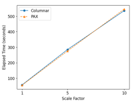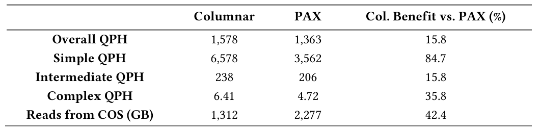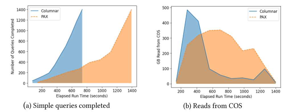 由于在 PAX 聚类情况下需要从对象存储读取58%更多的数据,缓存预热时间更长,影响了每小时查询次数(QPH)。当工作数据集完全缓存后,从对象存储的读取和写入缓存层的写入将停止,在此期间我们看到大多数中间和复杂查询完成,因此列式和 PAX 聚类之间的 QPH 差异并不那么明显