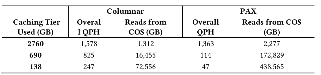 由于读取了不必要的列PAX缓存效率较低,列式存储与 PAX 在 QPH上的差异被放大。对于 690 GB 和 138 GB 的缓存,列式聚类 QPH 分别比 PAX 聚类高 7 倍和 5 倍。