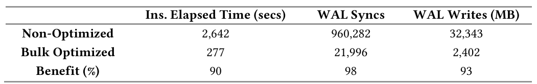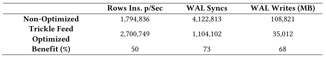 同时,微批量每秒可插入的行数增加了 50%,成功将 WAL 同步次数和写入 WAL 的字节数分别减少 73%和 68%。为了恢复目的,WAL 必须位于具有相对较高写入延迟的持久块存储上。