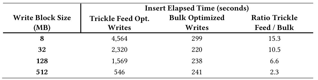 为了在这两种选项之间做出选择,我们决定对两种情况都进行实验:批量插入场景和并发查询工作负载。批量插入是从一个表到另一个表的子查询插入,我们通过改变源表的大小来运行。