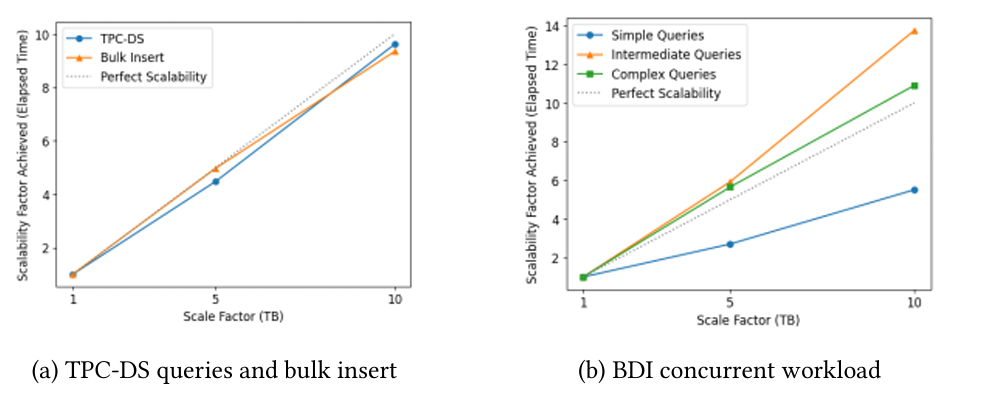 BDI 数据库扩展到 1TB、5TB 和 10TB 时运行 99 个 TPC-DS 查询(从冷缓存开始,每个查询依次执行一次)和批量插入的结果。在 10TB时,更高规模变得更多依赖于磁盘,可扩展性偏离完美约 38%。在简单查询的情况下,在并发设置中实现了更好的可扩展性。