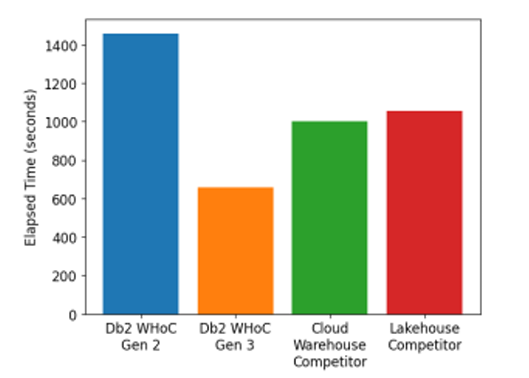 测量内部优化之外,还进行了一些竞争对比,硬件及其他配置相同时,1TB TPC-DS工作负载的性能对比如图,可以看到Db2 Warehouse on Cloud Gen 3 服务在 AWS 上(使用云原生 COS)相对 Gen 2 服务(使用网络附加的块存储)以及其他两个存储有着更卓越的性能。