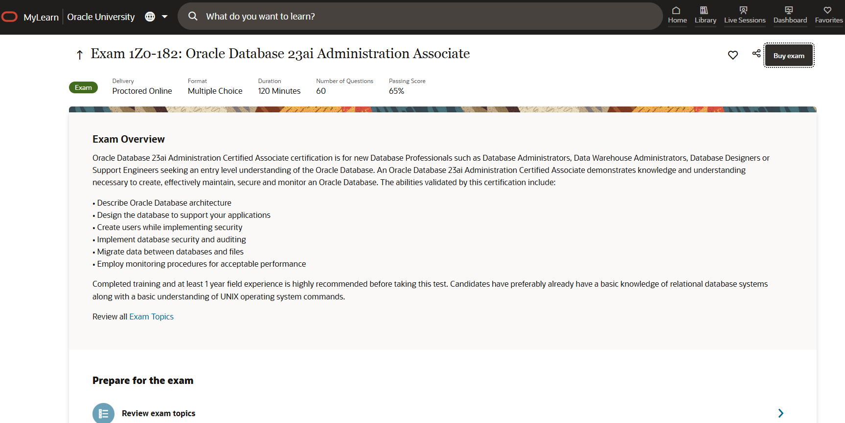 Exam 1Z0-182: Oracle Database 23ai Administration Associate - Oracle MyLearn