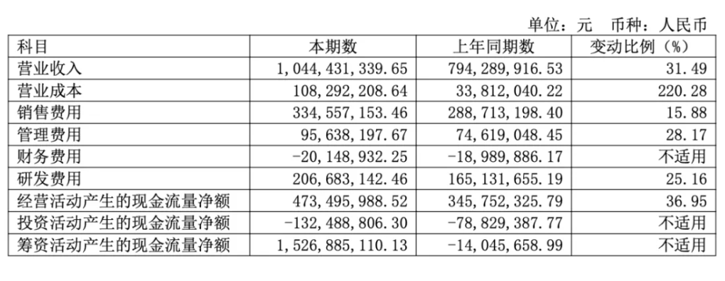 主营业务营收 10.43 亿,较上年同期增长 31.64%。
