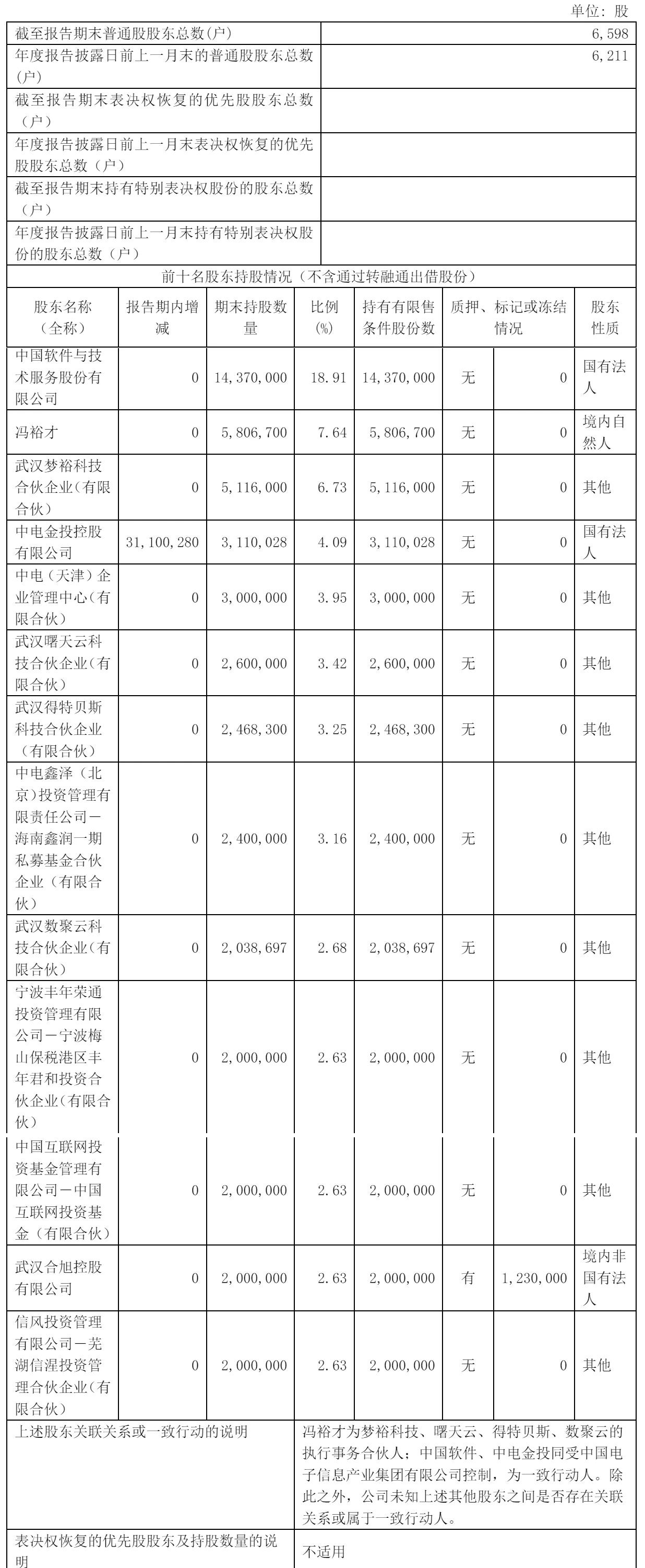 截至2024年12月31日,中国软件与技术服务股份有限公司持股为18.91%,冯裕才直接持股为7.64%,武汉梦裕科技合伙企业(有限合伙)持股为6.73%,中电金投控股有限公司持股为4.09%。