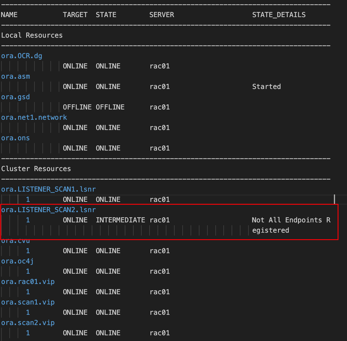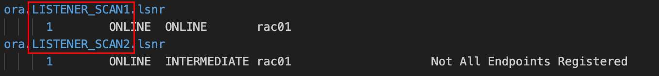 可以看到这里 /etc/hosts 中重复的部分确实会导致 Not All Endpoints Registered 问题。当不使用 DNS 进行解析 SCAN 的时候,都是通过识别 /etc/hosts 文件中的 rac-scan 对应的解析进行配置集群,可以看到这里 rac-scan 有两行,所以会创建 2 个 scan 监听: