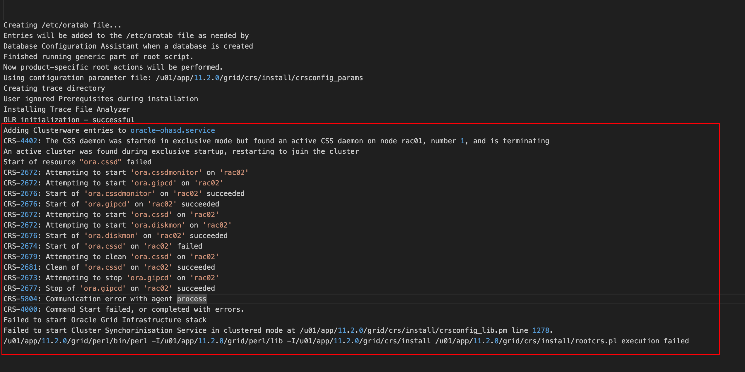 可以看到这里集群状态有问题,大概率是 root.sh 执行有问题,检查 root.sh 日志: