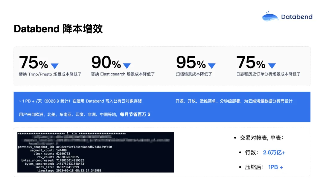 在数据归档场景中,其降本逻辑类似——通过廉价的对象存储和高压缩比的数据处理方式,大幅降低存储开销。例如,一位大型客户每天可向系统中摄入 1PB 的数据,这在传统架构下几乎是难以承受的成本,而在 Databend Cloud 的支持下,成本则变得极具竞争力。