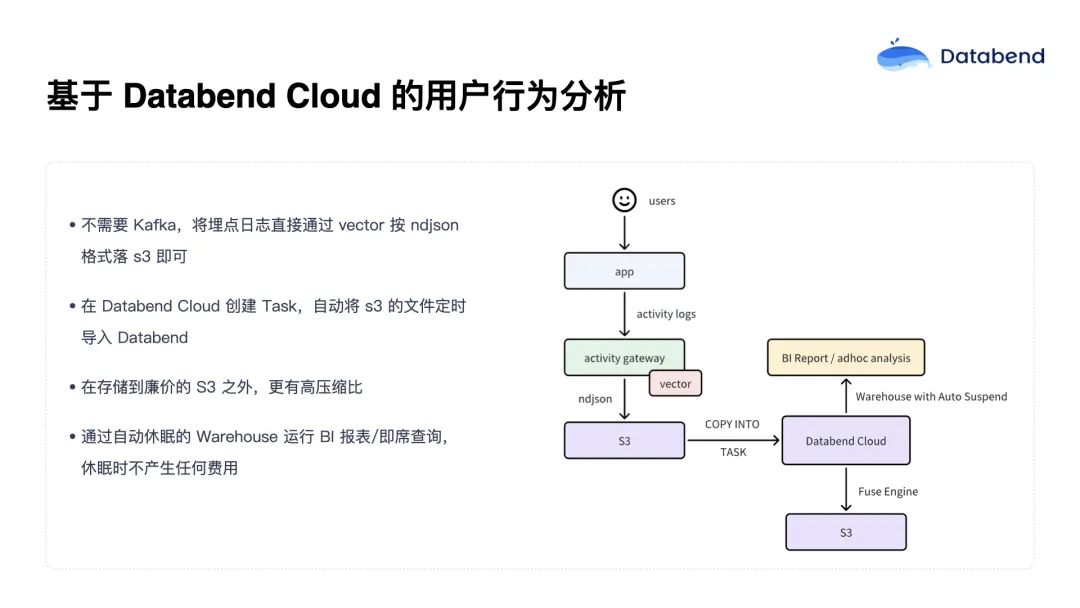 其中,针对用户行为数据分析,Databend Cloud 提供了极具优势的简化架构和运维体验。