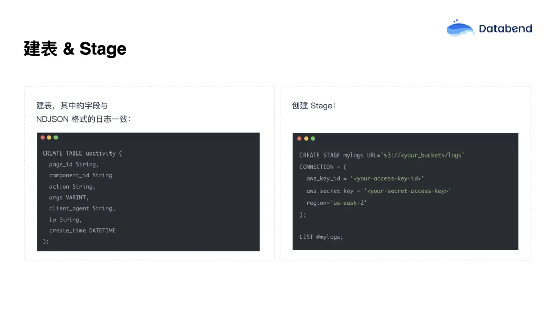 然后再创建一个 Stage。Stage 可以理解为映射到对象存储(如 S3)中的某个目录。只要将日志文件写入该目录,Databend Cloud 就能自动识别并导入。