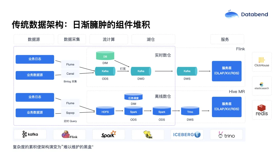 从积极的一面来看,这样的架构具有较强的可扩展性;但从现实使用层面看,它更像是一种“堆叠”而非真正的“统一架构”。随着组件数量的增加,系统的整体复杂度也在不断提高。每新增一个组件,不仅在能力层面带来了提升,同时也带来了新的复杂性。比如在一个数据采集到 ETL 再到报表输出的完整链路中,每增加一个组件,都会带来数据口径管理上的额外挑战,一旦出问题,需要跨多个组件排查,复杂度呈“层级式增长”。