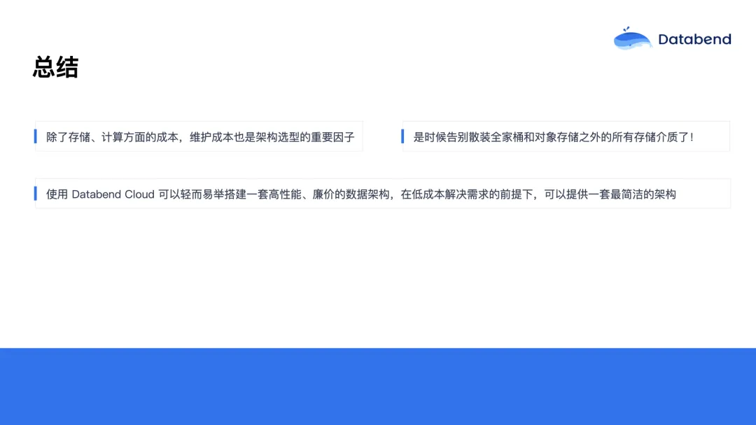 建议将对象存储作为架构设计中的核心部分。实践证明,在数仓场景下,对象存储不仅具备显著的性价比优势,还能配合计算引擎实现出色的性能表现。通过 Databend Cloud,用户可以快速构建一套高性能、低成本、连接灵活的数据分析架构。在满足业务需求的同时,这种简洁的架构设计也意味着更低的运维成本,而低运维成本也间接带来了资源成本的进一步降低。