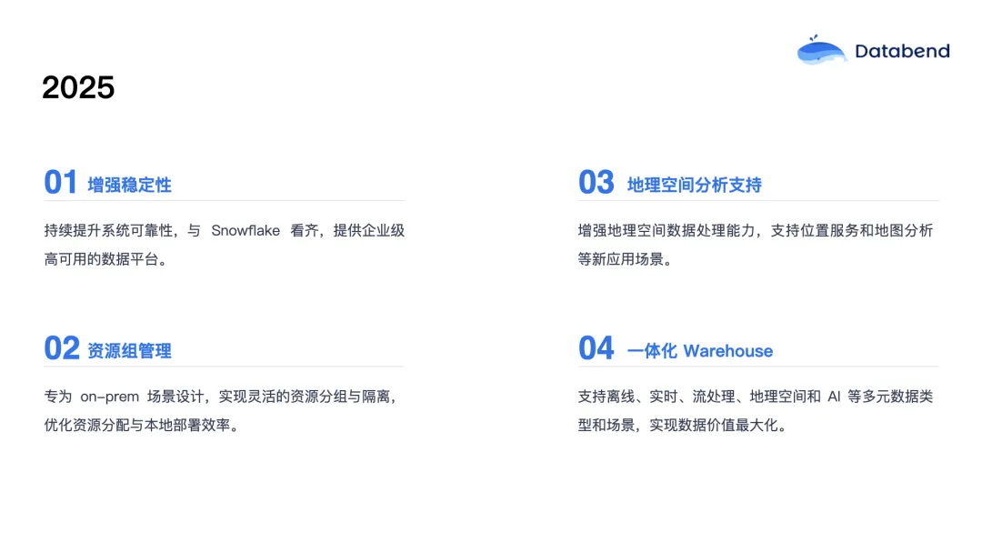 关于 2025 年的发展规划,目标是打造业内最高可用性的数据平台,并进一步提升资源管理的精细化能力,实现资源分组与隔离的灵活配置,同时在本地部署和资源调度之间实现更好的平衡。