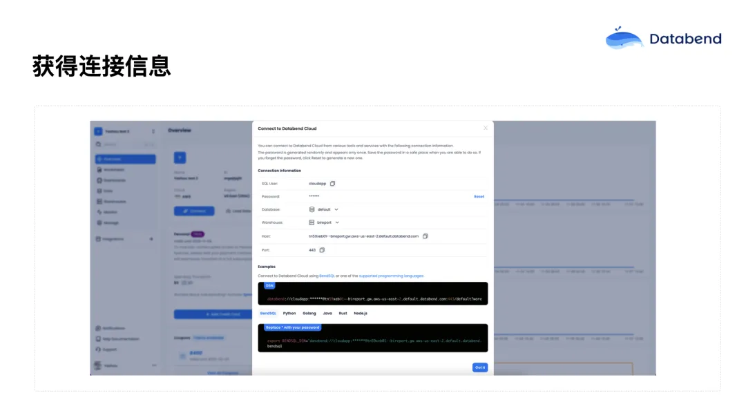 Warehouse 创建好之后,可以在 Databend Cloud 首页中获取连接串信息(Connect 字段),用于连接各种 Driver 或生态系统中的工具。