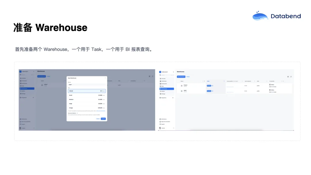 首先,在 Databend Cloud 上,可以创建一个 Warehouse。Databend 的 Warehouse 是基于使用时长计费的,正如前面提到的,BI 报表以及数据分析师的工作通常集中在每天的两到三个小时内,所以这套按需计费模型可以带来非常可观的成本节约。