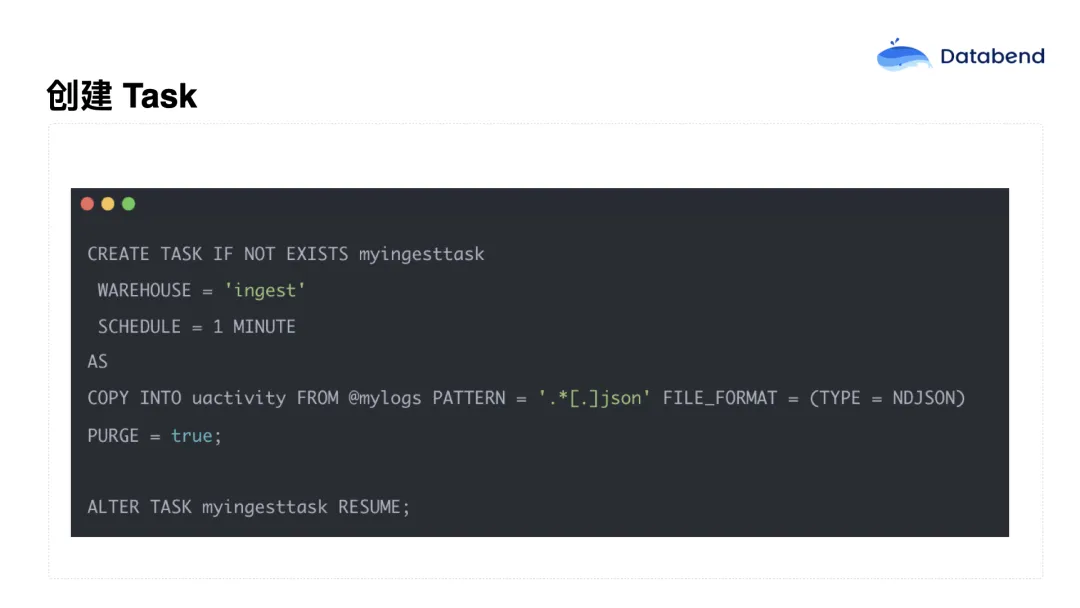 接着创建一个 Task,设置为每分钟执行一次。这个 Task 的作用是将指定 Stage(也就是 S3 目录)中的 JSON 文件自动导入到 Databend 中的表里。