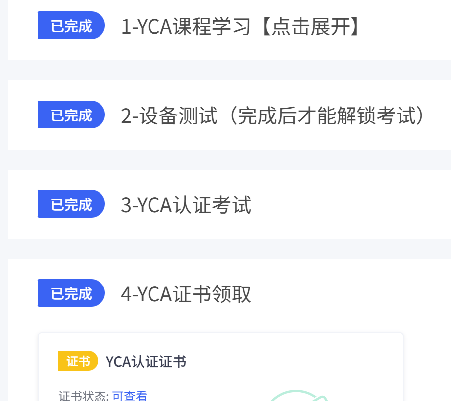第一个就是yca的课程,很简练,然后需要通过第二个设备测试才能解锁yca认证考试,考完立即就能看到成绩,然后通过就有证书了,很简单。