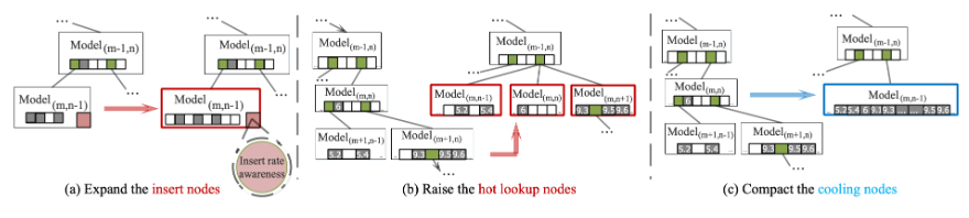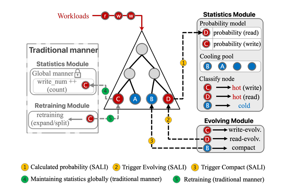 SALI利用基于概率的轻量级方法来维护统计信息,同时保持节点重新训练/进化的时间准确性,不会阻塞多个线程的插入操作