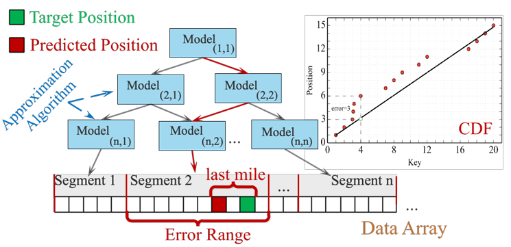 学习型索引核心是利用一组学习模型估计存储数据的累积分布函数(CDF),以此预测数据存储位置。每个节点(或仅最低层叶节点)存储线性函数的斜率和截距,对应线性模型负责近似目标键位置,减少传统树型索引中的间接搜索操作,有望显著提升索引查找性能。