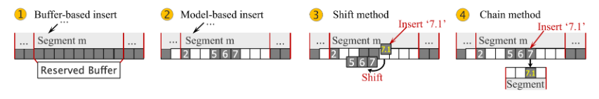 基于缓冲区的策略因密集存储键(无间隙)导致误差大。实验表明,精确查找可提升并发性能,细粒度锁有助于插入可扩展性,但维护统计信息可能限制索引可扩展性。新数据先写入缓冲区,满溢后合并到上层段并重建模型。