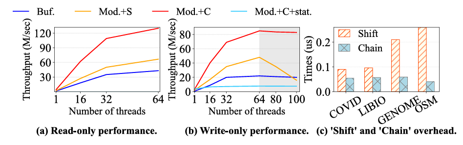 上图展示了三种结构的性能。基于缓冲区的结构用𝑏𝑢𝑓.表示(即XIndex的结构),基于模型的Shift方法策略用𝑀𝑜𝑑.+𝑆表示(即ALEX的结构),基于模型的Chain方法策略用𝑀𝑜𝑑.+𝐶表示(即LIPP的结构)