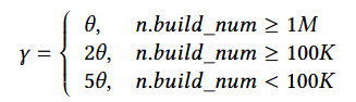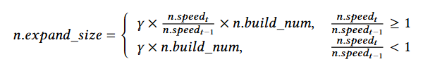 𝑛代表一个特定的节点,𝑛.𝑏𝑢𝑖𝑙𝑑_𝑛𝑢𝑚表示当前节点的大小。𝑛.𝑠𝑝𝑒𝑒𝑑代表时间𝑡的累积率,表示在该特定时间点新键插入节点的插入率。这意味着将比之前的扩展操作保留更多的空位。扩展因子𝛾的定义如下