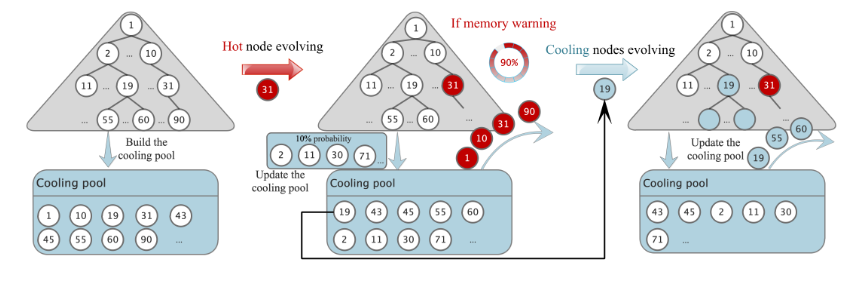 冷却池机制如下,节点创建时以10%概率加入冷却池,长期未访问则压缩(取消预留间隙,用PLA算法线性拟合,算法5)。