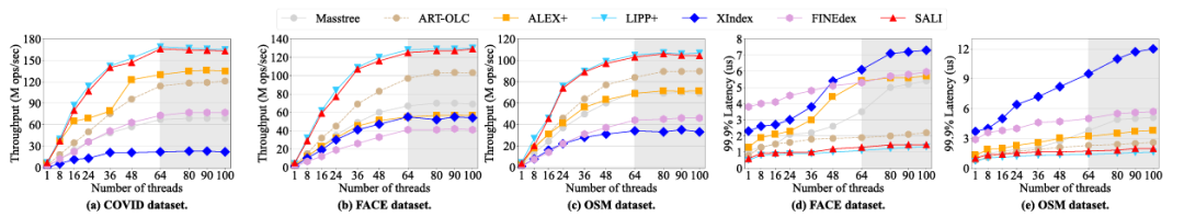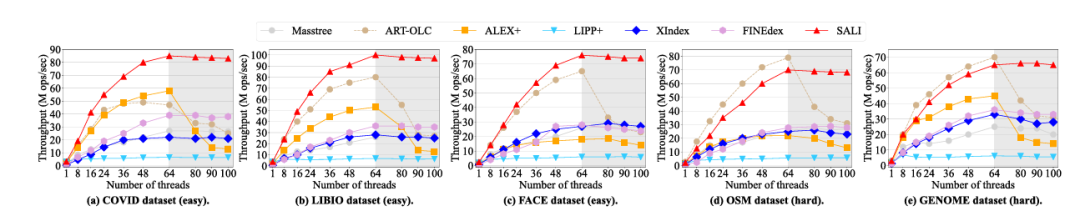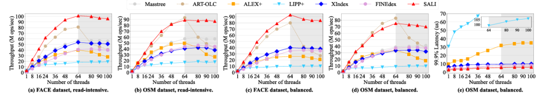 在密集数据集中,SALI的性能比其他学习型索引高出2.5倍至10倍,因为SALI可以精确地拟合复杂的累积分布函数(CDF),因此其性能可以与ART-OLC相匹配,同时性能甚至超过了逻辑线程的数量,而相比之下,ART-OLC的性能急剧下降。