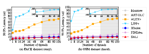 SALI的优势在于Easy数据集(COVID、FACE)中,吞吐量比ALEX + 和ART-OLC高47%-73%;在Hard数据集(OSM、GENOME)中,吞吐量提升2.5-10倍,尾延迟最低。