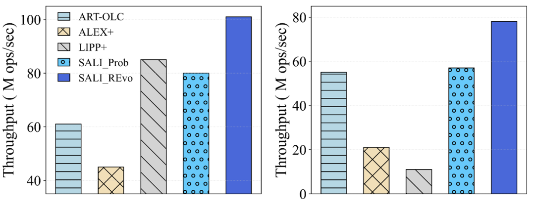 在OSM数据集上两个热读工作负载中学习索引的性能。SALI_Prob指的是仅使用概率模型的SALI,而SALI_REvo使用由读触发的演变策略。该图显示,在两个热读工作负载中,SALI_REvo分别比SALI_Prob高出27%和36%。在Hot-read-A工作负载中,SALI_REvo的性能已经超过了LIPP+。