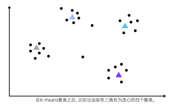 在IVFFLAT算法中,第一步是对向量进行k-means聚类,查找聚类质心(聚类中心点) 。假设在给定向量的情况下,执行 k-means聚类并识别出四个聚类及其质心,如下图: