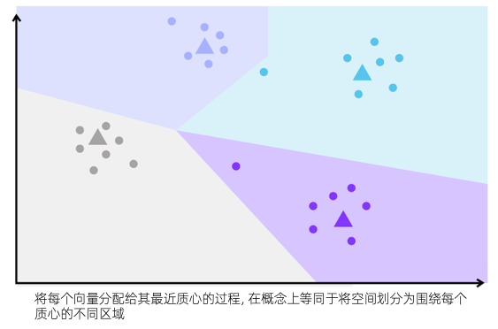计算质心后,下一步是将每个向量分配给其最近的质心。这是通过计算向量和每个质心之间的距离,并选择距离最小的质心作为最近的质心来完成的。该过程从概念上等同于将空间中的每个点,根据邻近度映射到最近的质心。