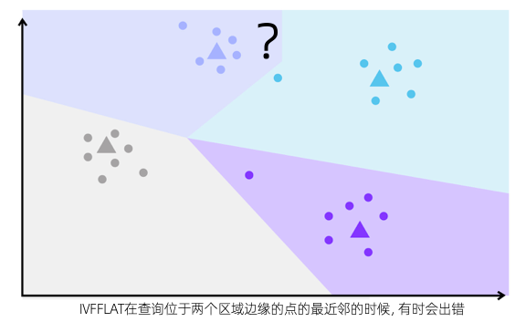 明显看出,尽管查询向量落在第一个区域,但其中一个向量(位于第二个区域)比任何第一个区域内的向量,更接近查询向量。这就是假设最近的向量总是和查询向量,在同一个区域的潜在误差。