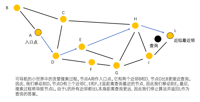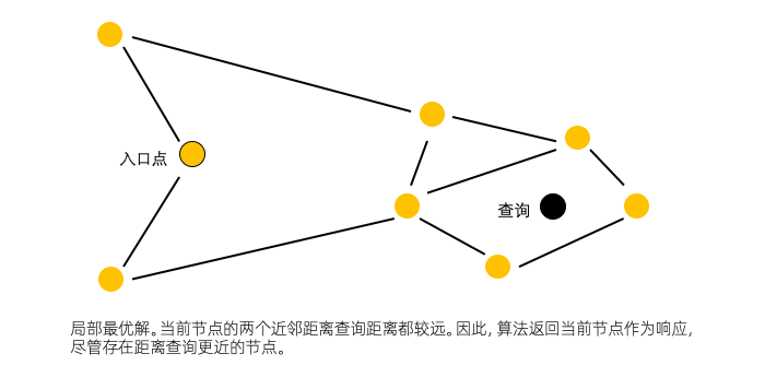 NSW是一个图结构。其中每个顶点都连接到其他顶点,形成好友列表。用NSW搜索将从与附近顶点相连的入口点开始,通过贪婪路由迭代地移动到最近的顶点。这个过程持续到达到局部最小值,即没有更近的顶点可用。