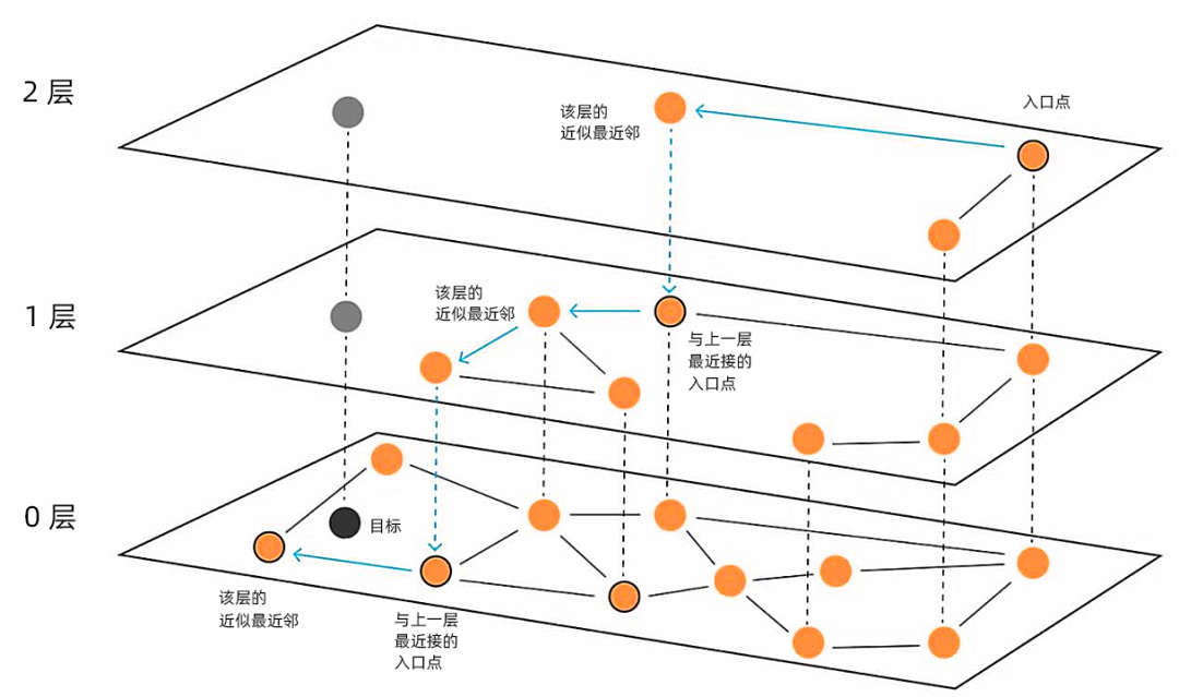 黑色的向量是要寻找的目标,想要知道离它最近的向量都有哪些,可以从最高层layer2开始,任选一个入口点,找到该层与其对应且离目标向量最近的向量。这就像跳表一样,可以很快缩小查询范围,进入到下一层。此时入口点就是上一层最接近的点,然后继续同样的动作,直至最下面一层。在HNSW中插入方法类似,但需要随机确定这个点出现的最大层l。