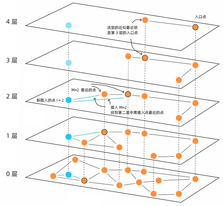 如下图新插入的点l=2,即它只会出现在0,1,2三层中。与查询过程同样,从最上层往下找,找到第2层中离插入点最近的点,并选择M个点构建邻居关系,在第1层和第0层以此类推。