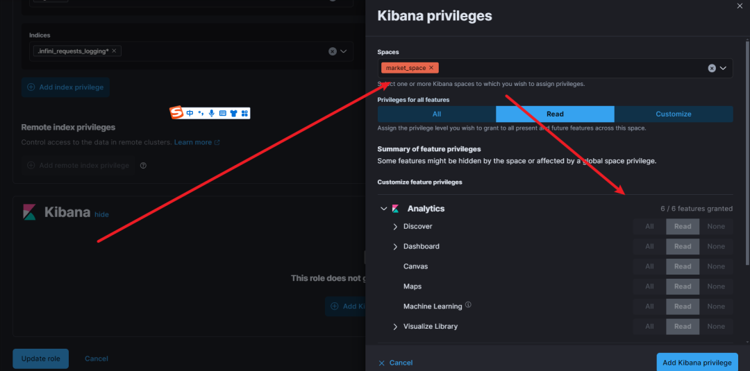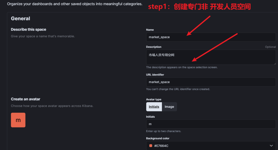 给 Kibana 设置权限分组; 只开放给有经验的运营、分析同事; Step1:设置 Spaces,控制不同空间不同权限。