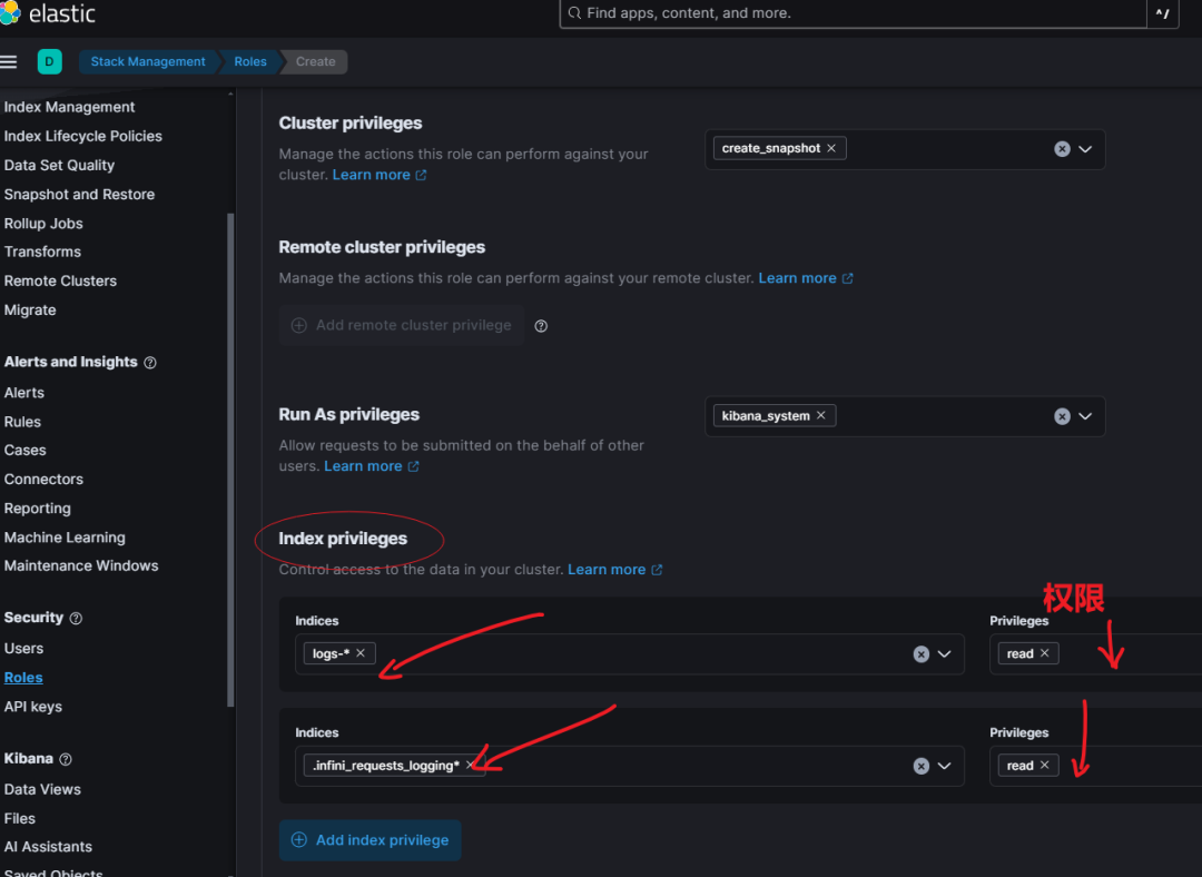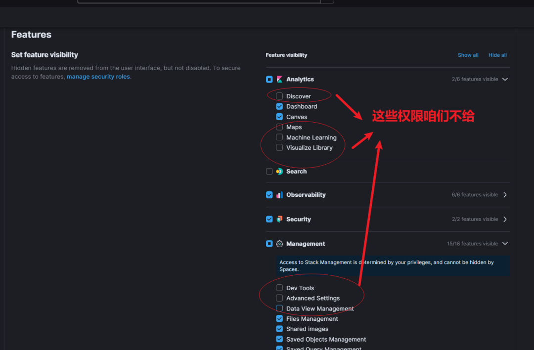 使用 Kibana Spaces 分级,不开放 Dev Tools 和 Discover 权限。