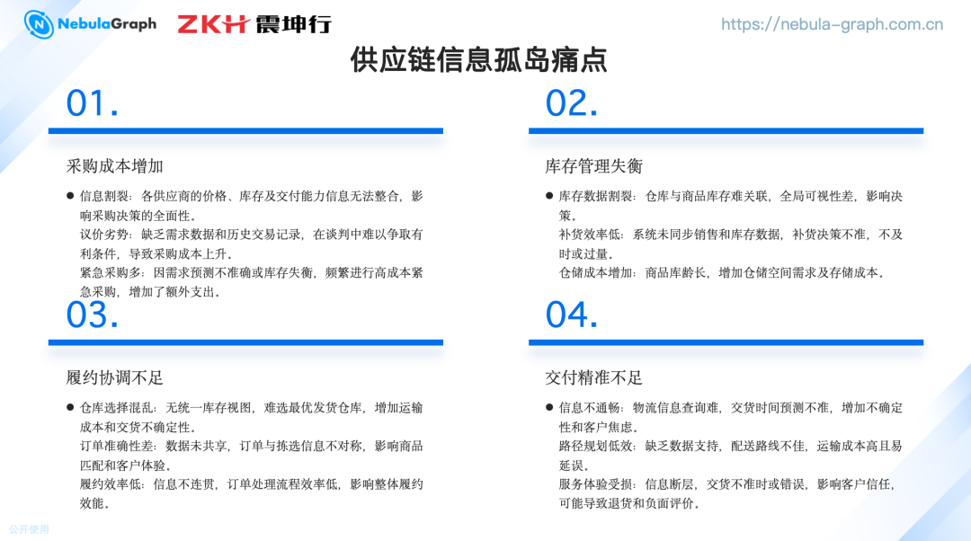供应商整合与采购成本:我们对接的供应商类型多样,包括原厂、代理和贸易商。由于缺乏统一的供应商信息整合,我们在采购决策时面临信息割裂的问题。 库存管理:震坤行在全国拥有 32 个仓库,其中包括专门存储化学品和危险品的特殊仓库。之前的库存管理是单节点的,无法实现全国库存的全局可视化管理 履约协调:客户订单处理需要智能选择发货仓库,以满足客户的交货时间和地址要求。 交付精准度:在交付环节,我们面临信息不通畅、路径规划低效和服务体验受损的问题。物流信息查询困难、交货时间预测不准确以及配送路线不佳都影响了客户体验。