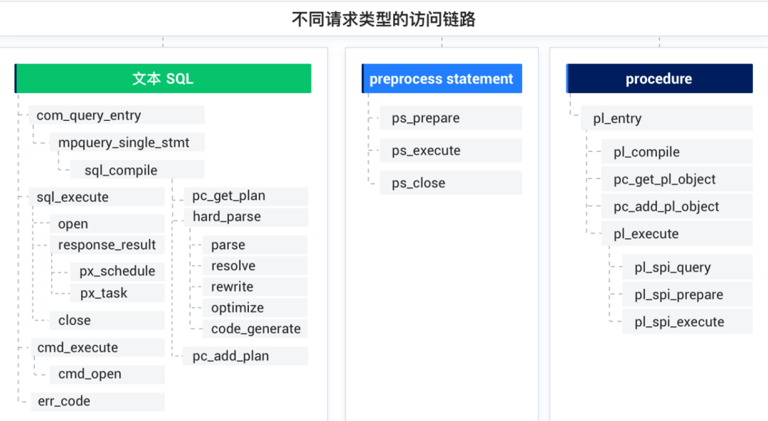 com_query_entry(同 com_query_process):查询过程 mpquery_single_stmt:单个语句的访问路径 sql_compile:编译 SQL pc_get_plan:获取执行计划 hard_parse:硬解析 parse:软解析 resolve:解析语法树的语义并生成语句 rewrite:重写 SQL optimize:进行基于成本的优化并生成执行计划日志 code_generate:根据执行计划日志生成物理执行计划 pc_add_plan:将生成的执行计划加入 plan cache sql_execute:执行物理执行计划 open:打开执行计划 response_result:执行计划过程和结果 px_schedule:按照 px 划分任务 px_task:执行 px 子任务 close:关闭执行计划