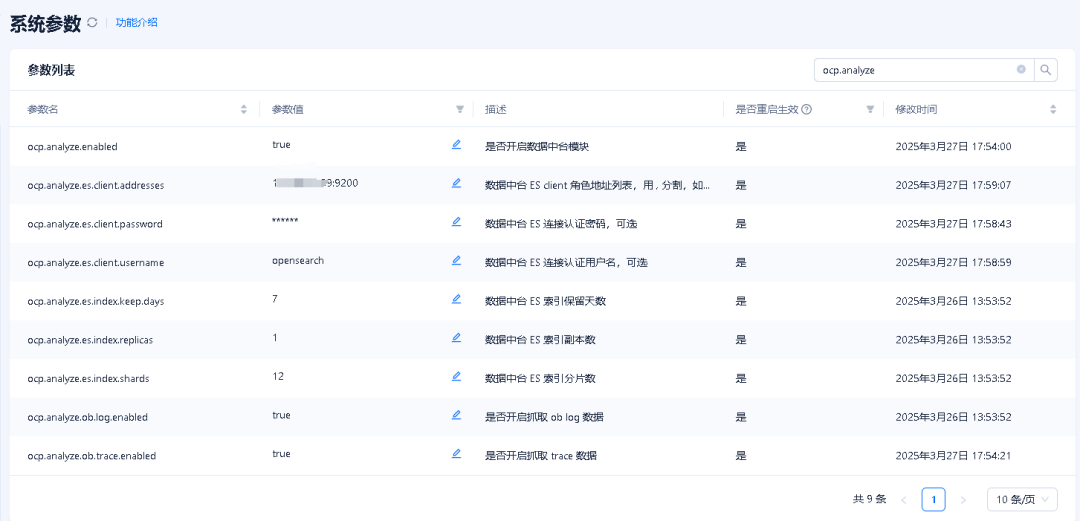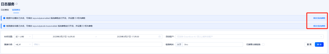 登录 OCP,左侧导航栏选择日志服务,点击链路查询,点击修改系统参数。
