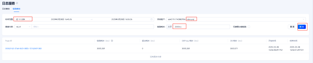 登录 OCP,左侧导航栏选择日志服务,点击链路查询,选择目标租户 obmysql,链路耗时可以填大于 2s,然后进行查询。