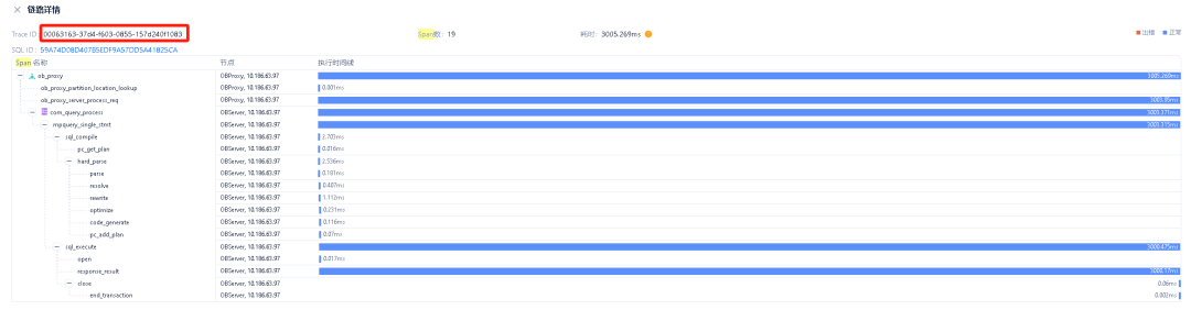 然后点击 Trace ID(00063163-37d4-f603-0855-157d240f1083),就可以看到 SQL 的全链路耗时信息(本示例中,耗时主要在 sql_execute 的子 Span response_result,同上部分 show trace 命令看到的结果一致)。