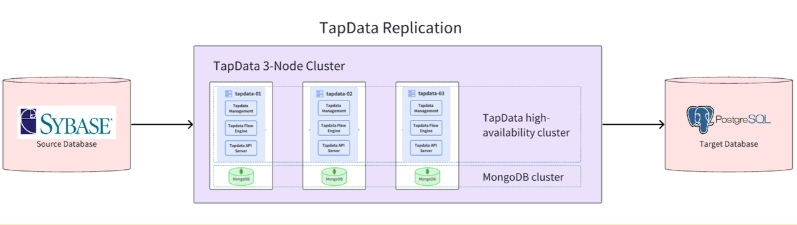 部署 TapData 三节点高可用集群,实现 Sybase ASE 至 PostgreSQL 的双向实时同步,支持故障时秒级回退至原库;