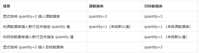 例如,如果源数据库中字段 quantity 的默认值是1,目标数据库也设置为同样的默认值,则具体场景如下: