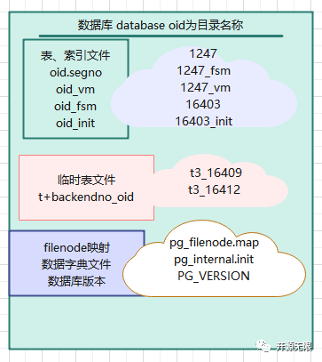 对于集簇里的每个数据库,在PGDATA/base里都有一个子目录对应,子目录的名字为该数据库在 pg_database里的 OID。这个子目录是该数据库文件的缺省位置;特别值得一提的是,该数据库的系统目录存储在此。