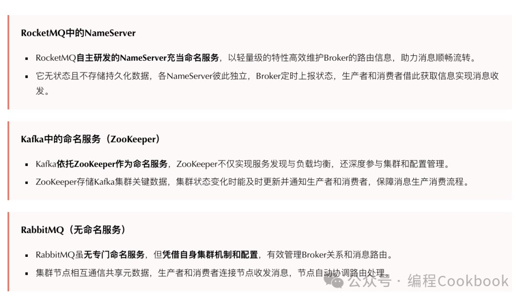 命名服务(NameServer):在分布式消息队列环境中,存在多个 Broker(消息中间件)。NameServer提供了服务发现和负载均衡的功能,生产者和消费者通过查询 NameServer 来发现可用的 Broker。