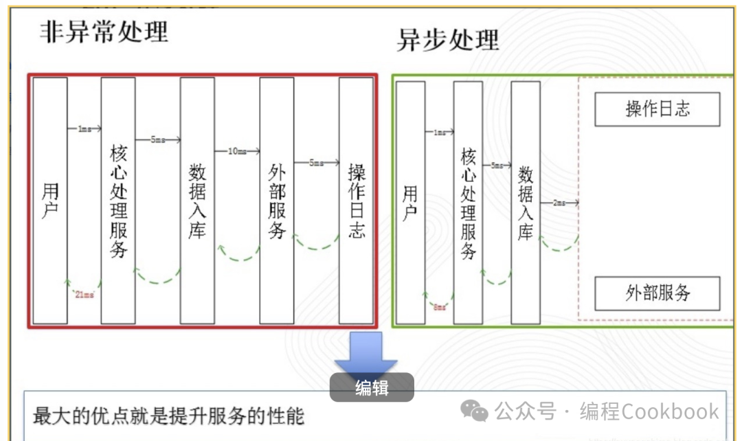 优势: 提高系统的响应速度和吞吐量。 适用于耗时操作(如发送邮件、生成报表等),避免阻塞主流程,提高系统的响应速度。