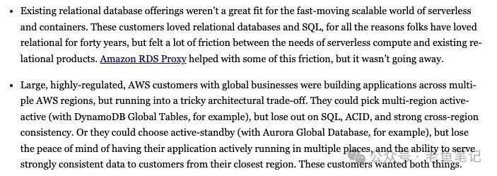 从老鱼查到的资料看,AWS在2021年决定构建一种全新的分布式关系型数据库,并解释了背后的一些技术驱动和动机。具体来说: