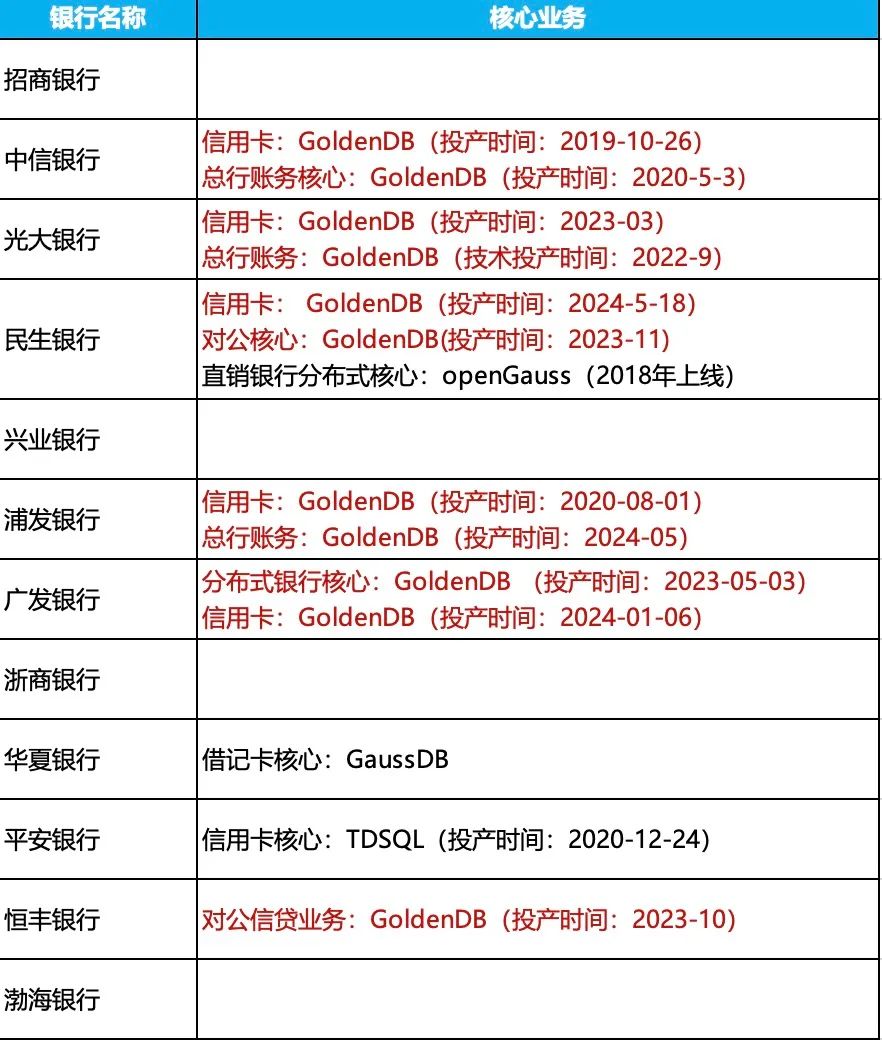 12家股份制银行核心系统国产数据库应用